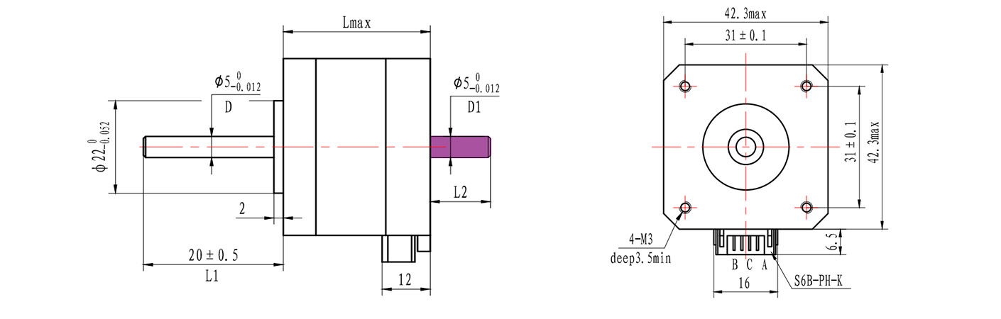 | 说明 | 电机机身长度,标准长度见技术参数 | 电机前出轴长度,建议长度上限60mm | 电机后出轴长度,建议长度上限40mm | 电机前后出轴轴径范围 ф5mm-ф10mm |