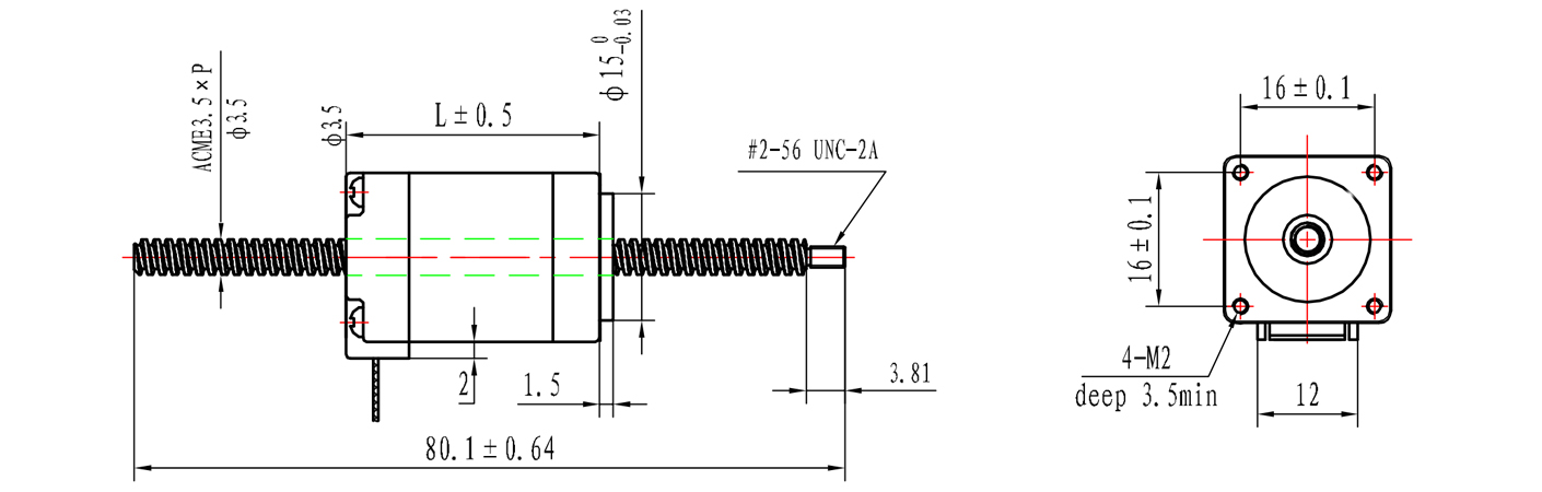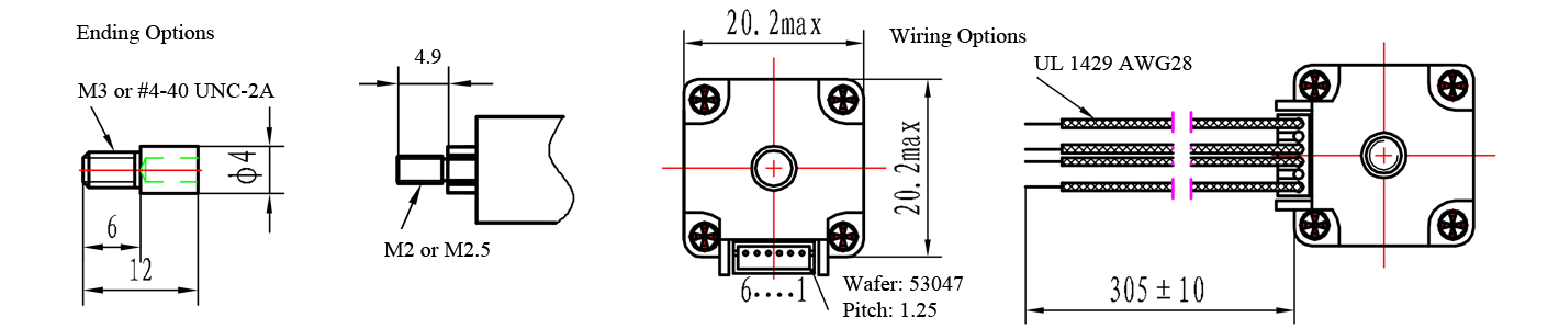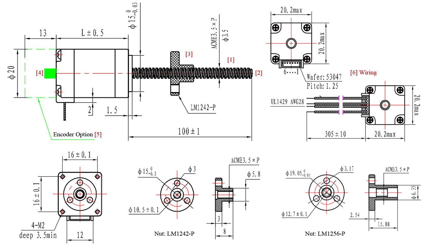 电压 V | 电流 mA | 导程 mm | 步长 mm | 推力 @100pps,整步 | 电阻 Ω | 电感 mH |